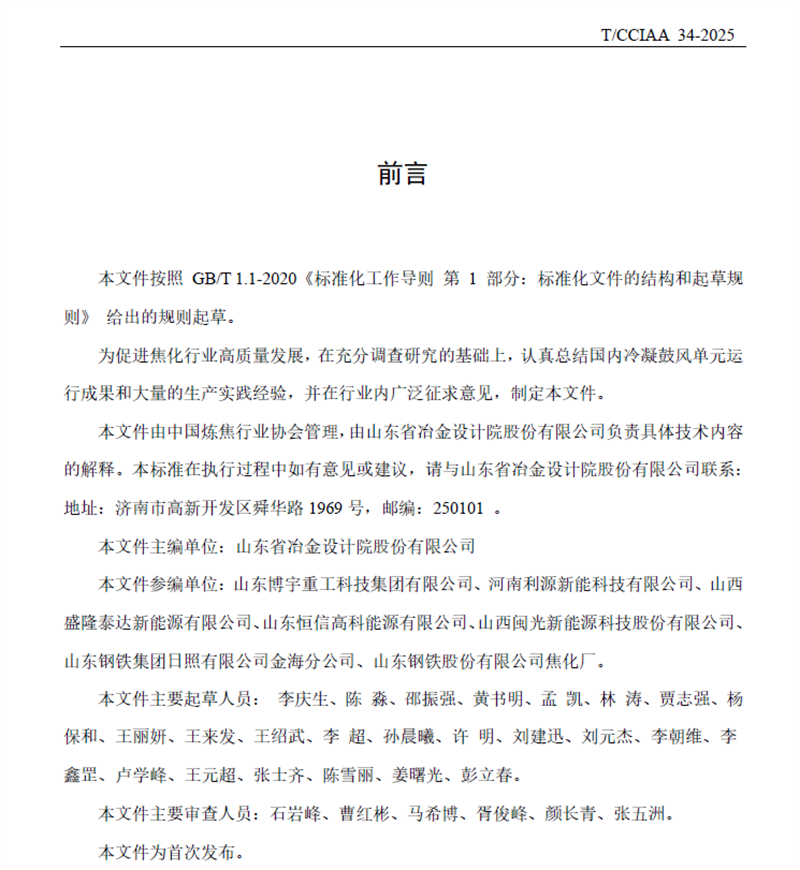 7月18日,由山冶設計主編的《焦爐煤氣初冷器工藝技術規范》T/CCIAA 34-2025(簡稱《規范》)正式發布并實施。《規范》對焦化煤氣凈化初冷器的工藝流程、操作參數以及質量指標作出了詳細規定,同時統一了初冷器的設計與操作標準,保障了煤氣冷卻過程的高效性與安全性。《規范》的發布與實施,可指導焦化企業在生產過程中有效把控初冷器的日常操作,為后續煤氣凈化及深加工的穩定運行創造有利條件。這是繼2024年7月1日正式實施、山冶設計主編的《焦爐煤氣脫硫廢液干法制酸技術規范》YB/T6115 - 2023之后的又一個行業規范,充分體現了山冶設計在焦化行業的技術引領作用與品牌影響力。